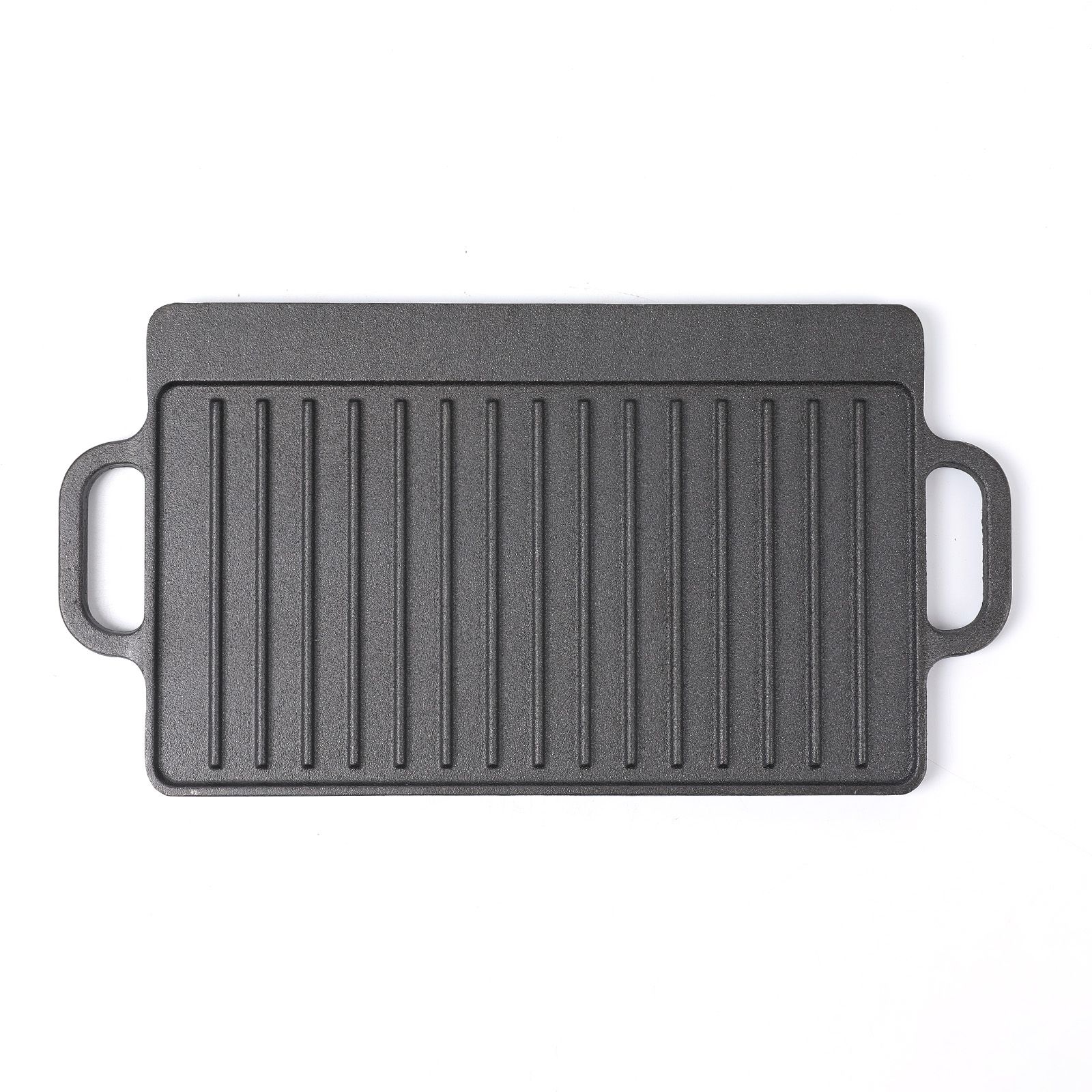 Searing meat, chicken & fish. Camping, fishing & general use. Cooking on single, 2 &3 burner stoves, Induction cooking Size:12.6"x8" Large Enough for the Family, Versatile Enough for your Recipes. The 12.6" x 8" Reversible Cast Iron Rectangular Griddle, If you need a flat cooking surface, you got it or maybe you want grill marks on that chicken? Just turn it around to expose its double personality. It has been pre-seasoned, making it nonstick and it is just waiting for you to start flipping it with recipes.
