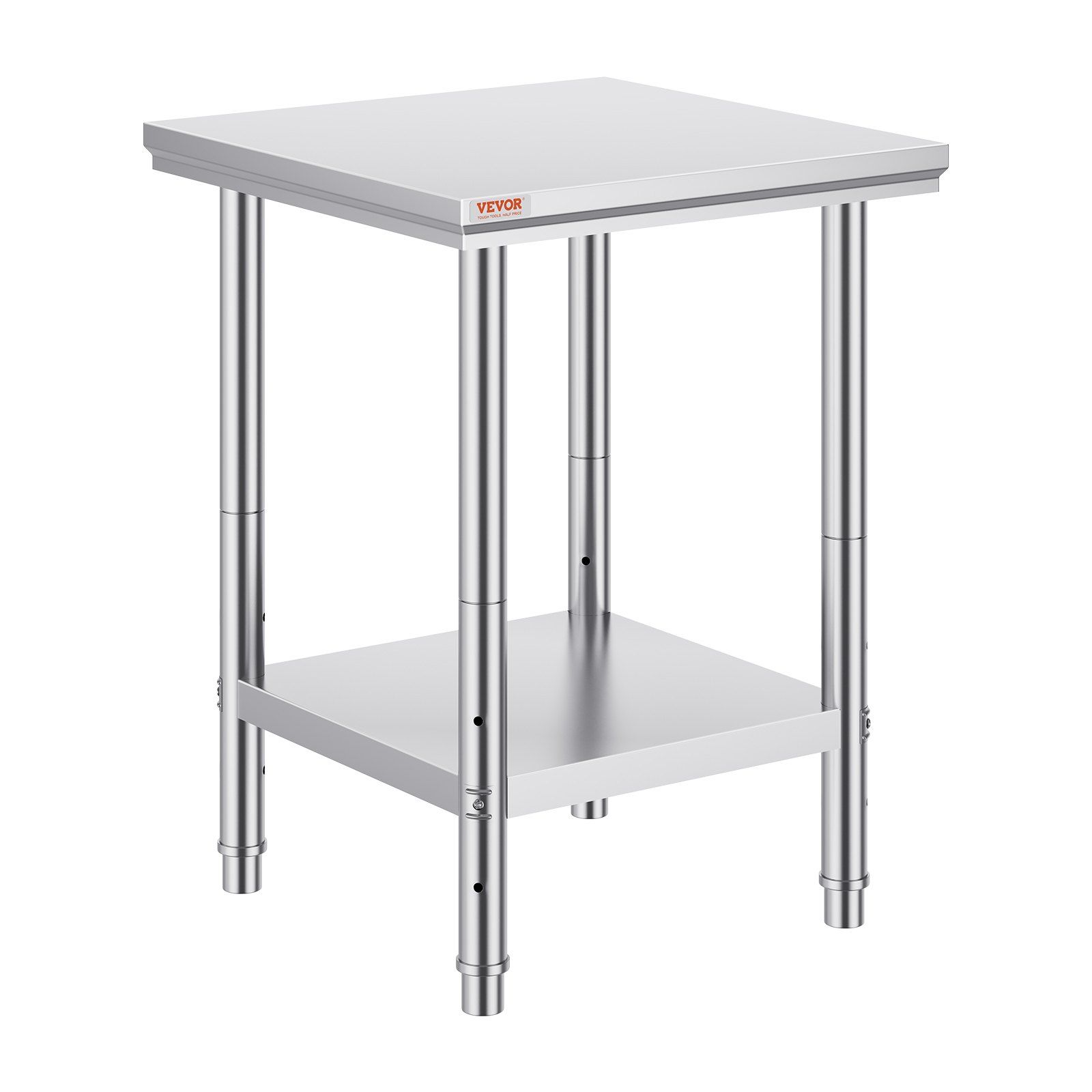 Highlights: 1.High-Quality Stainless Steel: This work table, measuring 24 x 24 x 31 inch, is made from SUS201 stainless steel for the tabletop, shelves, and legs. It offers superior rust resistance, a sleek appearance, and a smooth surface that is easy to clean with a simple wipe. 2.Stable and Durable: With an upgraded thickness of 0.8mm, this table is sturdy and durable. The upper shelf supports up to 400 lbs, while the lower shelf supports up to 300 lbs, providing ample storage for your supplies and allowing you to stack your favorite ingredients easily. 3.Adjustable Height Design: The 3-level adjustable shelves offer the most user-friendly and practical features. Simply adjust the shelf height with screws to accommodate items of different sizes. 4.Versatile Applications: Beyond storage, our table can be used for chopping vegetables, kneading dough, cutting meat, and other kitchen-related tasks. It is perfect for use in bars, restaurants, hotels, buffets, catering events, school activities, or office break rooms. 5.Practical Sizes: Available in various sizes to perfectly fit your kitchen needs. Whether for commercial kitchens, home renovations, or your garage setup, our professional-grade stainless steel work table series is designed for lasting performance and reliability. We recommend measuring your space before purchasing.